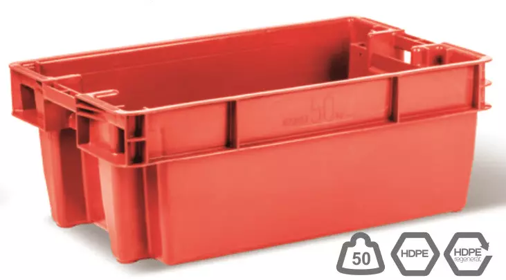 Пластикові ящики для м’яса і м’ясних виробів виготовляються з лінеарного поліетилену (HDPE) і барвників, що відповідають умовам дотику з харчовими продуктами. Призначені для зберігання і транспортування м’ясних товарів.
